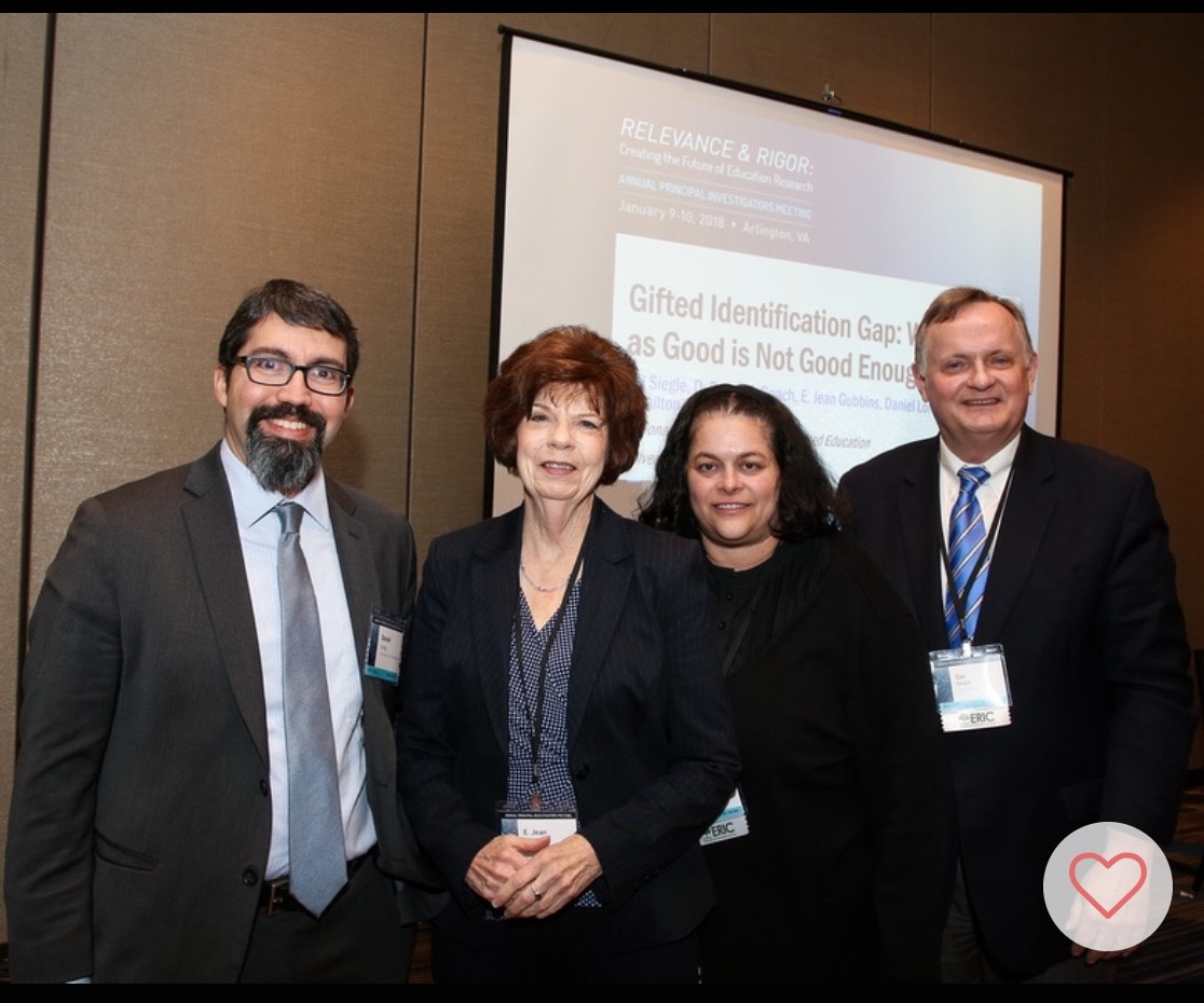 Daniel Long, E. Jean Gubbins, D. Betsy McCoach, and Del Siegle presented the NCRGE’s first three years’ research findings at the IES Relevance and Rigor PI meeting in Washington, DC in January.